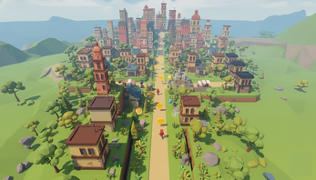 Stunning Stylized World: Explore a unique, low-poly urban landscape filled with towering skyscrapers, lush stylized trees, and atmospheric lighting.
